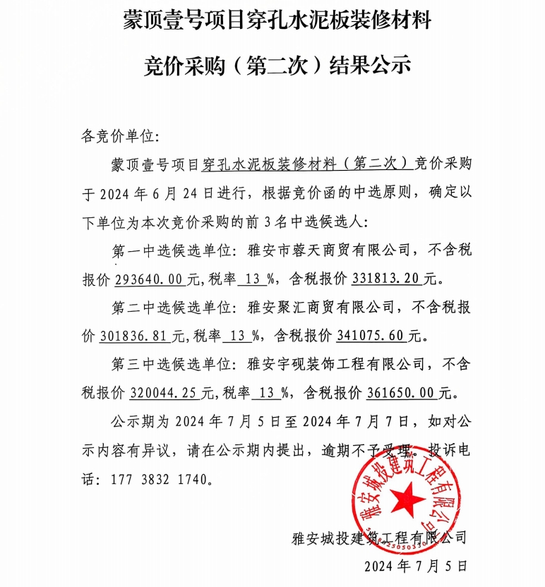 蒙頂壹號(hào)項(xiàng)目穿孔水泥板裝修材料競(jìng)價(jià)采購(gòu)(第二次)結(jié)果公示