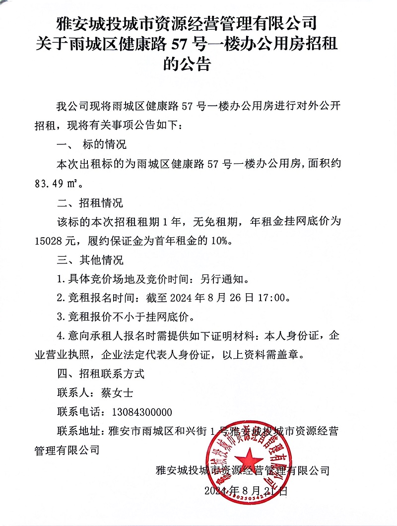 雅安城投城市資源經(jīng)營管理有限公司關(guān)于雨城區(qū)健康路75號一樓辦公用房招租的公告