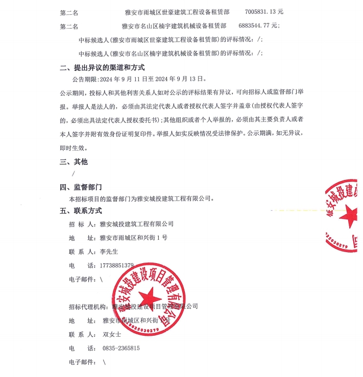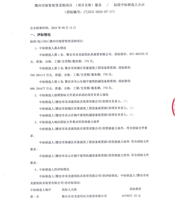 雅州印架管租賃采購項目(項目名稱)服務(wù)/標(biāo)段中標(biāo)候選人公示公告