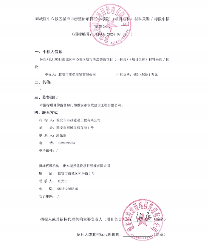 雨城區(qū)中心城區(qū)城市內(nèi)澇整治項(xiàng)目(一標(biāo)段)(項(xiàng)目名稱)材料采購(gòu)/標(biāo)段中標(biāo)結(jié)果公示
