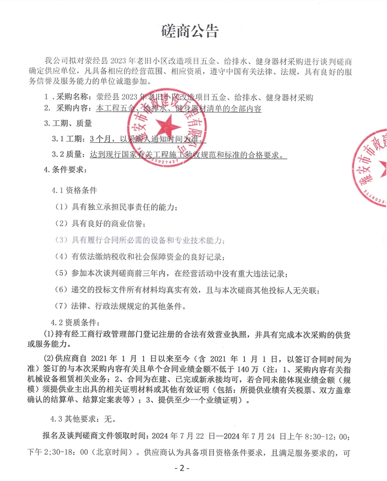 滎經(jīng)縣2023年老舊小區(qū)改造項(xiàng)目五金、給排水、健身器材采購(gòu)磋商公告
