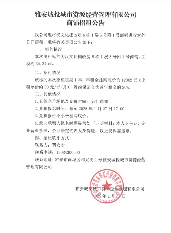 雅安城投城市資源經(jīng)營(yíng)管理有限公司商鋪招租公告