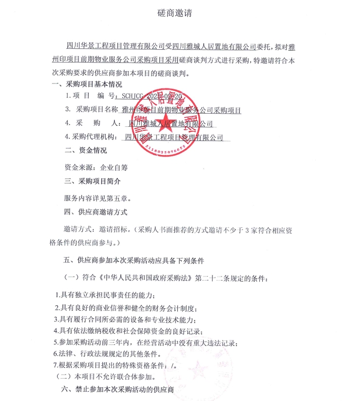 雅州印項(xiàng)目前期物業(yè)服務(wù)公司采購項(xiàng)目磋商邀請