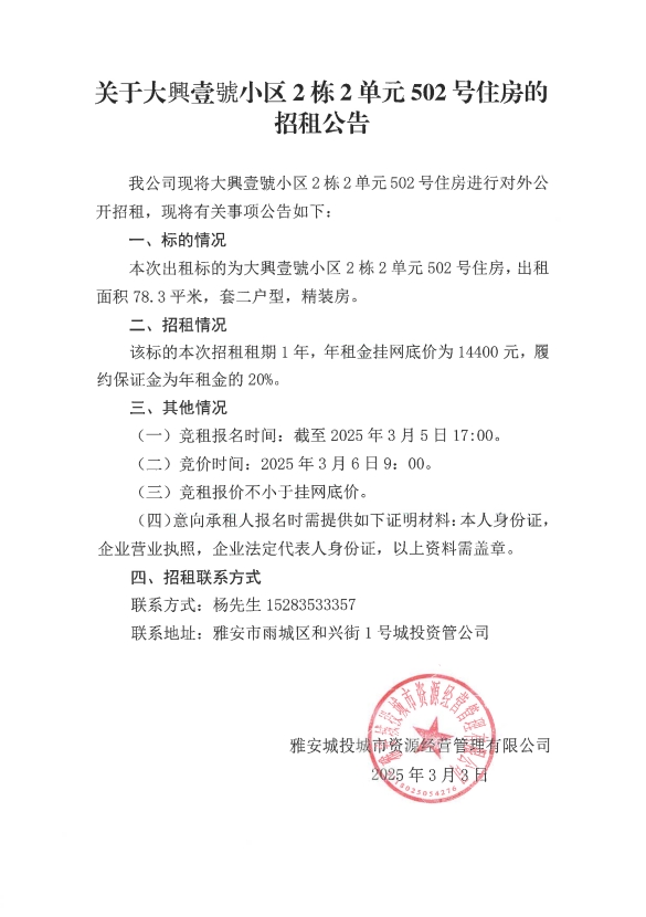 關于大興壹號小區(qū)2棟2單元502號住房的招租公告