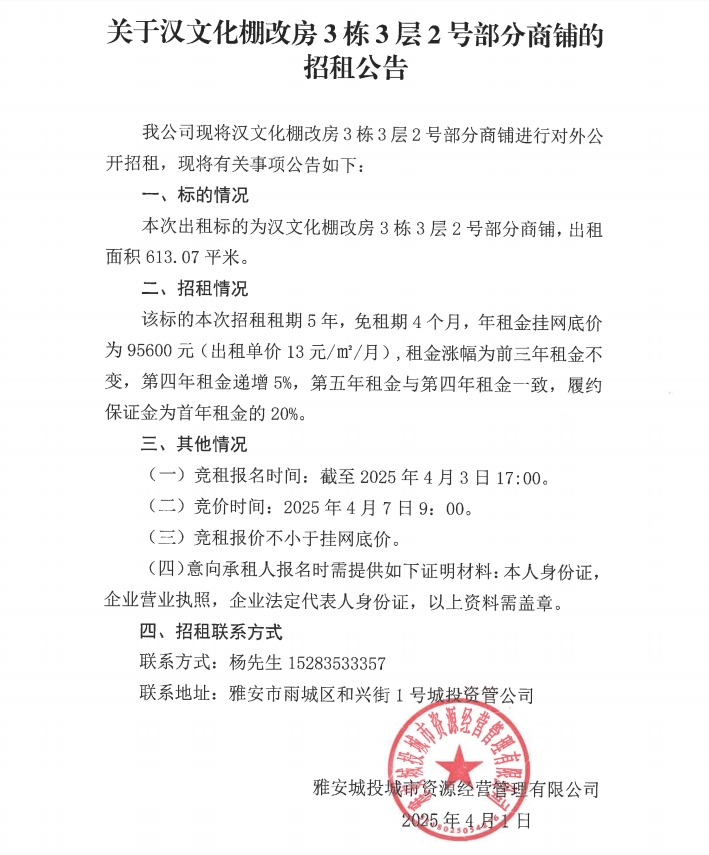 關于漢文化棚改房3棟3層2部分號商鋪的招租公告