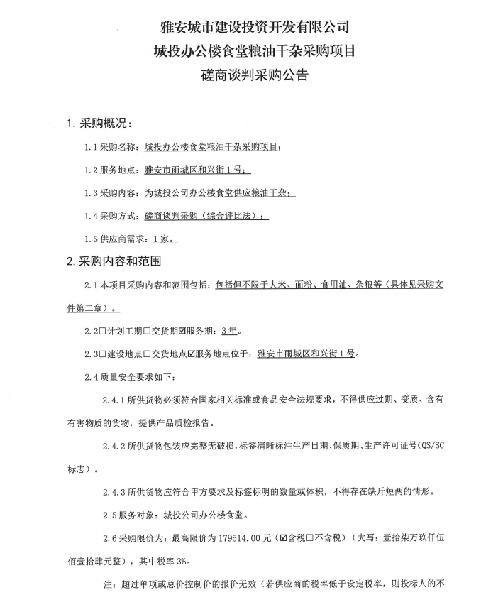 城投辦公樓食堂糧油干雜采購項目磋商談判采購公告