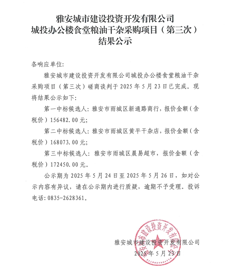 雅安城市建設(shè)投資開發(fā)有限公司城投辦公樓食堂糧油干雜采購(gòu)項(xiàng)目(第三次)結(jié)果公示