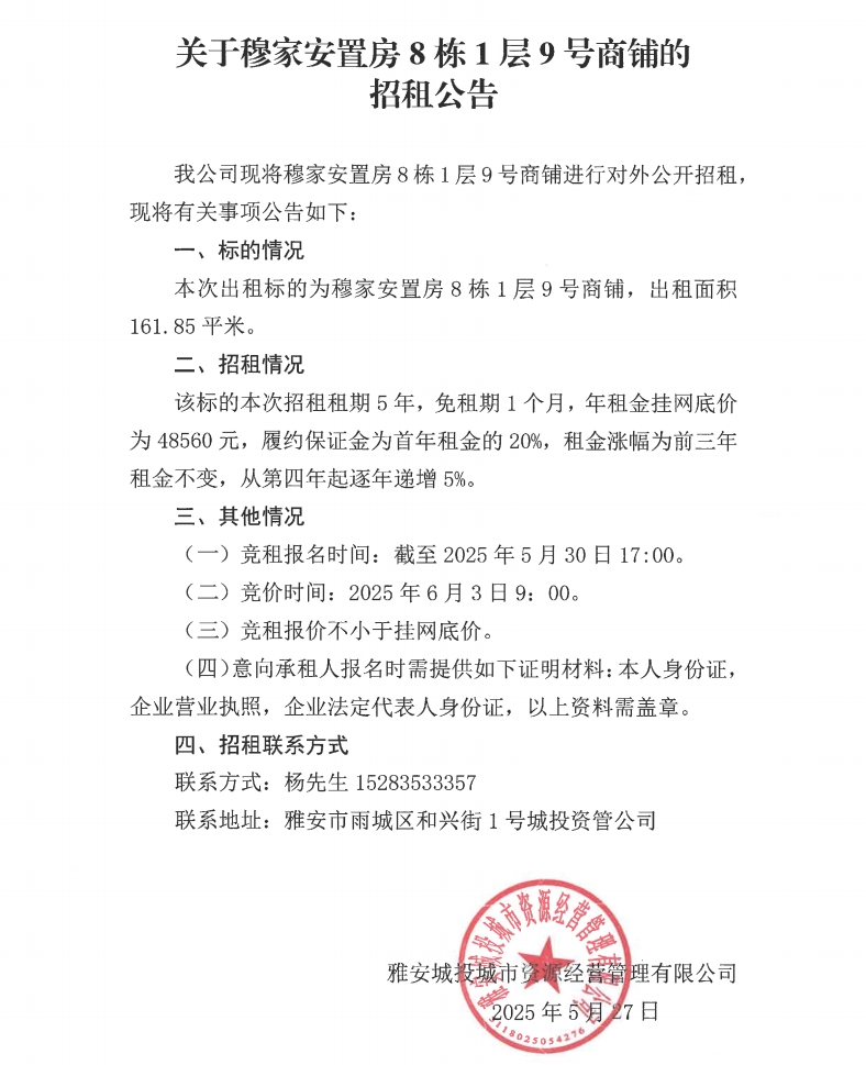關于穆家安置房8棟1層9號商鋪的招租公告