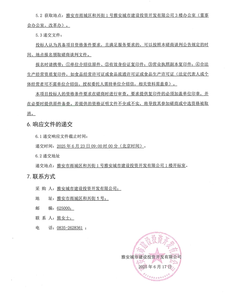雅安城市建設(shè)投資開發(fā)有限公司城投辦公樓食堂食材(肉類及蔬果類)采購項目磋商談判采購公告