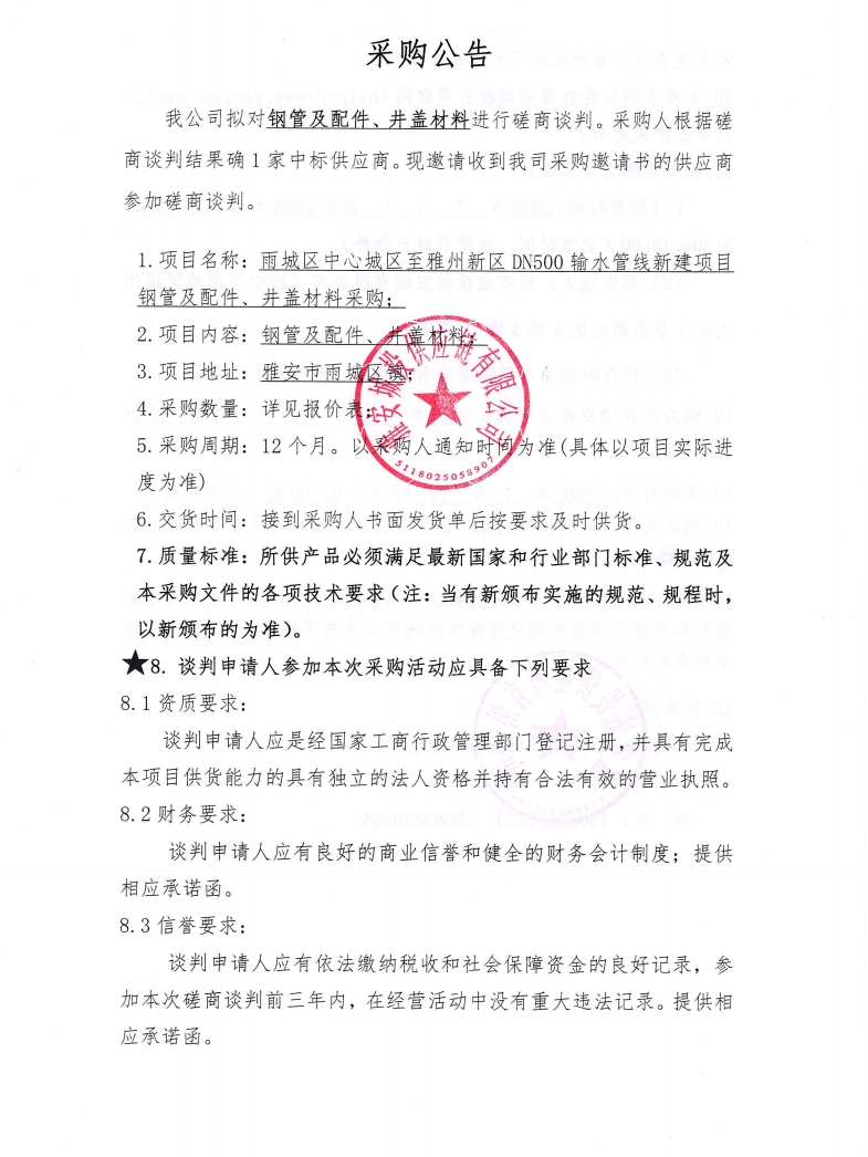 鋼管及配件、井蓋材料采購(gòu)公告