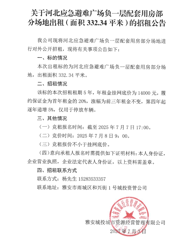 關于河北應急避難廣場負一層配套用房部分場地出租(面積332.34平米)的招租公告