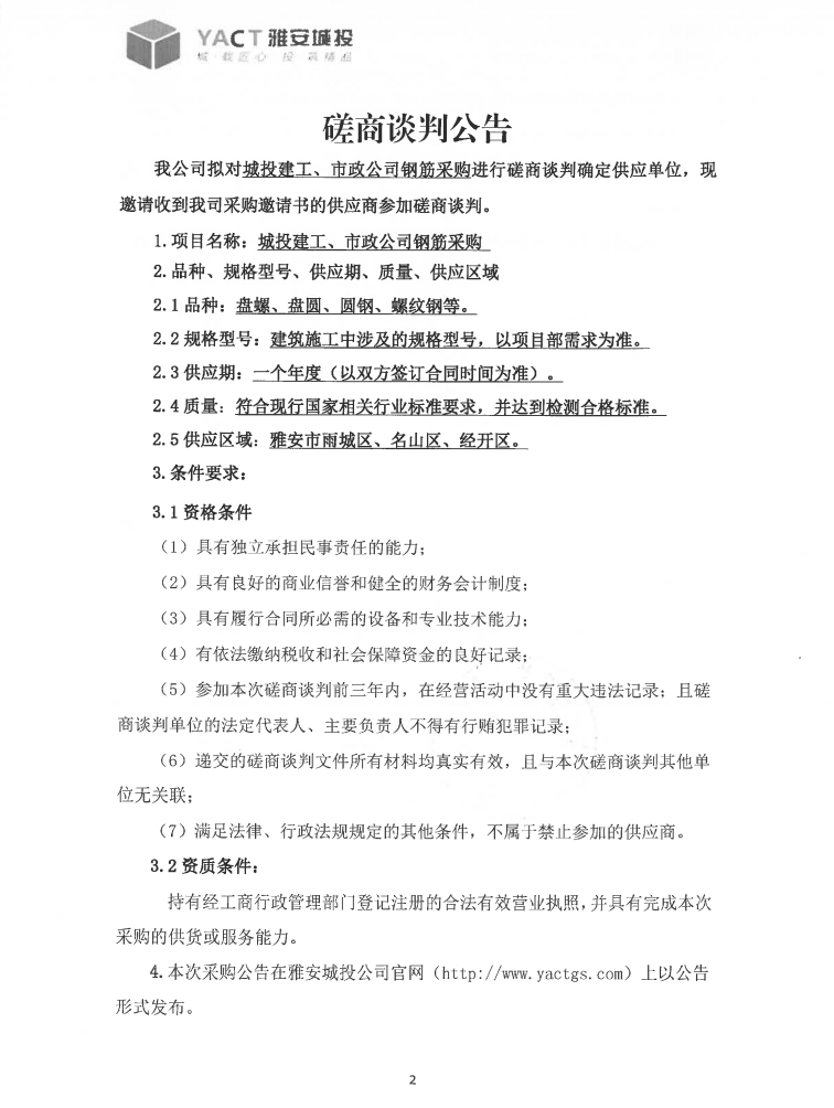 城投建工、市政公司鋼筋采購磋商談判公告