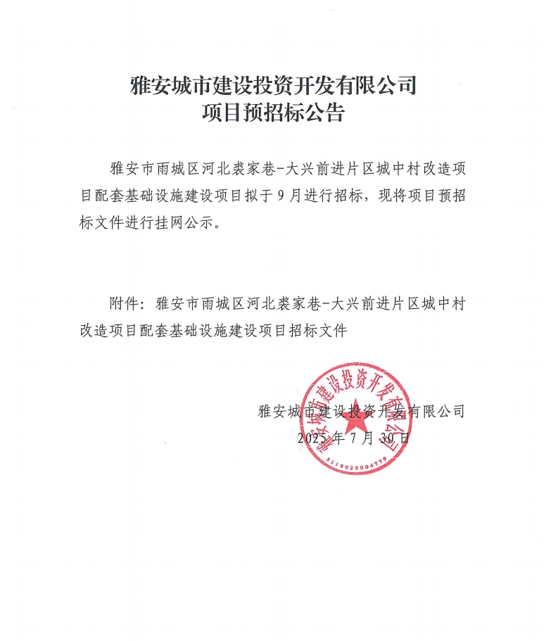 雅安市雨城區(qū)河北裘家巷-大興前進片區(qū)城中村改造項目配套基礎設施建設項目預招標公告