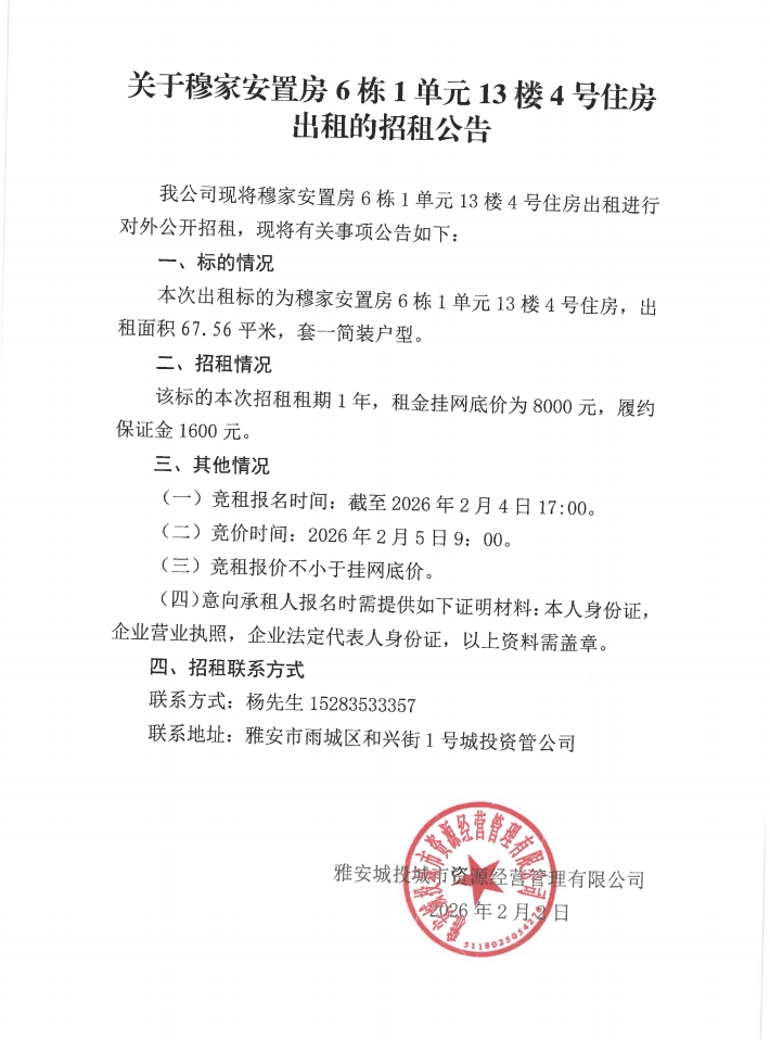 關(guān)于穆家安置房6棟1單元13樓4號住房出租的招租公告