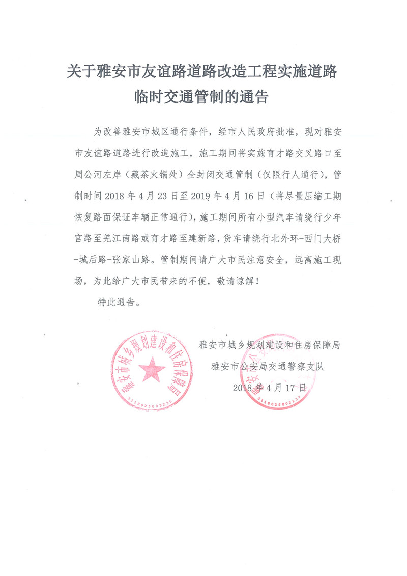 關(guān)于雅安市友誼路道路改造工程實施道路臨時交通管制的通告